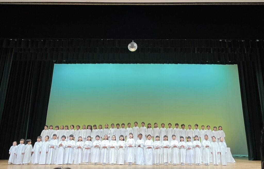 「み告げ」「帰郷」「羊飼い」「降誕」の4つの場面で構成され、様々なパートに分かれ、準備の段階から練習をかさね、教職員も総出で指導・補助にあたり、みんなでイエス・キリストの誕生を讃美しました。