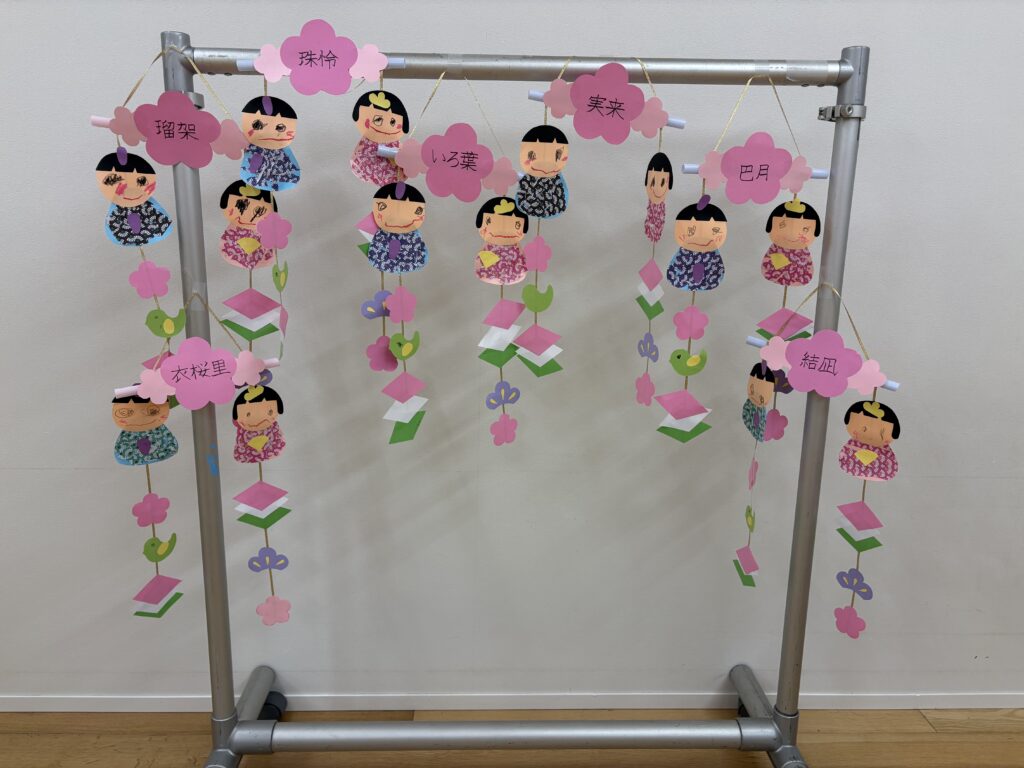 ひばり組 ひなまつりに向けて、吊るしひな制作を楽しみました。丸や四角の形に触れながら、好きな色を選び、指先を使って、ちぎって張り合わせました。揺れる飾りを見て「ゆらゆら〜」と嬉しそうに眺める姿がとてもかわいらしかったです。