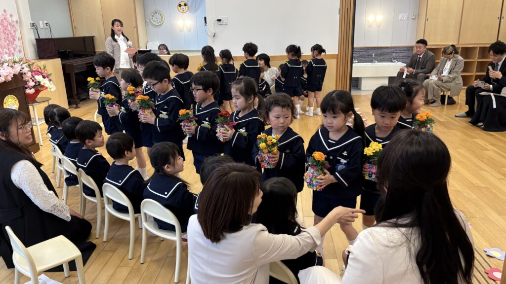 今年度から在園児のつぼみ・ほほえみ組も一緒に参列し、お歌やお花の贈呈式もありました🌼